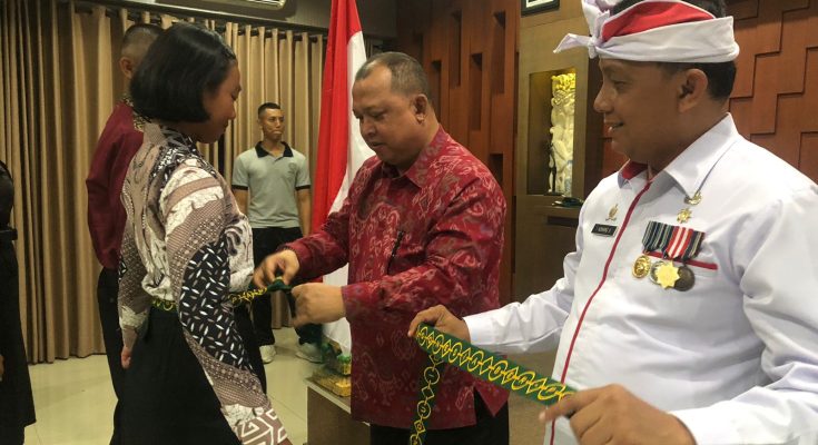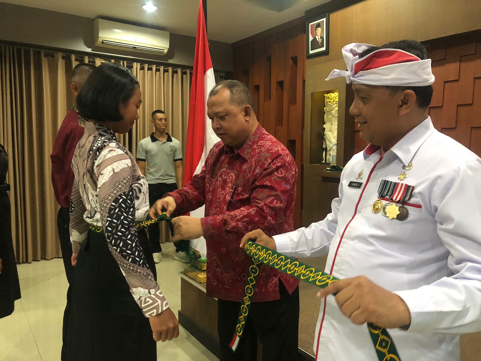 Kamis malam (14/8), Kepala Badan Kesatuan Bangsa dan Politik (Kaban Kesbangpol) Provinsi Bali, Gede Suralaga kenakan Kendit keseluruh 74 Calon Pasukan Pengibar Bendera Pusaka (Paskibraka) Provinsi Bali Tahun 2025 dengan didampingi Kepala Bidang Ideologi, Wawasan Kebangsaan dan Karakter Bangsa, Komang Kusumaedi.