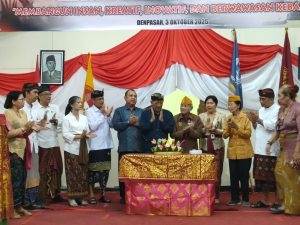 Kepala Badan Kesatuan Bangsa dan Politik (Kaban Kesbangpol) Provinsi Bali, Gede Suralaga bacakan sambutan Gubernur Bali pada acara HUT ke-74 Yayasan Kebaktian Proklamasi yang sekaligus dirangkaikan dengan HUT ke-40 STISPOL Wira Bhakti dan HUT ke-16 SMKS Wira Bhakti Denpasar bertempat di Kampus Wira Bhakti, Kreneng Denpasar (Jumat, 3 Oktober 2025).