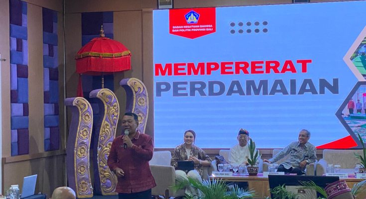 Adhi Tiana yang membawakan materi “Mempererat perdamaian Warga yang heterogen”. menyampaikan Badan Kesbangpol Bali telah bersinergi dengan Organisasi Kemasyarakatan, Yayasan beserta Paguyuban dan Komunitas yang ada di Bali untuk mempererat perdamaian antar umat beragama melalui kegiatan-kegiatan yang telah dilaksanakan seperti Kemah Kebangsaan, Bhakti Sosial, Dharma santhi Nyepi, Dialog Umat Beragama serta kegiatan-kegiatan lainnya sesuai dengan Peraturan Bersama Menteri Agama dan Menteri Dalam Negeri Nomor: 9 Tahun 2006 dan Nomor: 8 Tahun 2006 Tentang Pedoman Pelaksanaan Tugas Daerah/Wakil Kepala Daerah Dalam Pemeliharaan Kerukunan Umat Beragama, Pemberdayaan Forum Kerukunan Umat Beragama dan Pendirian Rumah Ibadat.