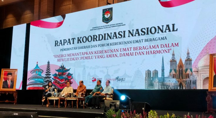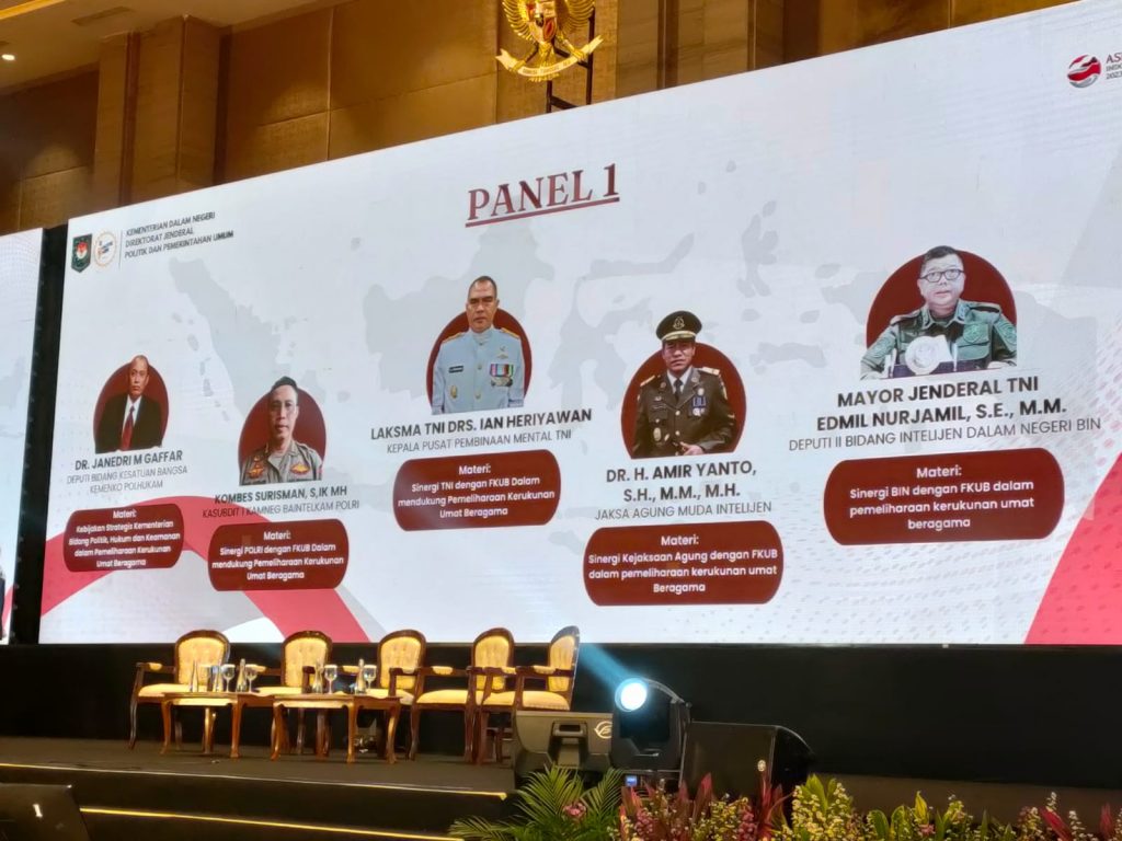 Selasa, 28 Pebruari 2023. Badan Kesatuan Bangsa dan Politik Provinsi Bali yang diwakili Kepala Bidang Ketahanan Ekonomi, Sosial Budaya, Agama dan Organisasi Kemasyarakatan, Dra. Gusti Nyoman Ramiasih,MH. beserta Analis Organisasi Masyarakat, Ni Wayan Suasthini, SE.,M.AP. menghadiri Rapat Koordinasi Nasional (Rakornas) Pemerintah Daerah (Pemda) dan Forum Kerukunan Umat Beragama (FKUB) se Indonesia. Kegiatan yang dilaksanakan oleh Direktorat Jenderal Politik dan Pemerintahan Umum Kementerian Dalam Negeri Republik Indonesia ini mengundang seluruh Gubernur, Kepala Badan Kesbangpol Provinsi, Ketua FKUB, Bupati/Walikota, Kepala Badan Kesbangpol Kabupaten/Kota, beserta Kepala Kanwil Kementerian Agama, bertempat di Hotel Novotel, Tangerang, Banten.