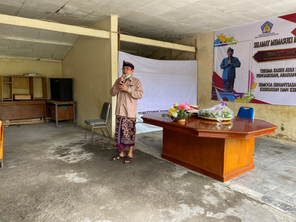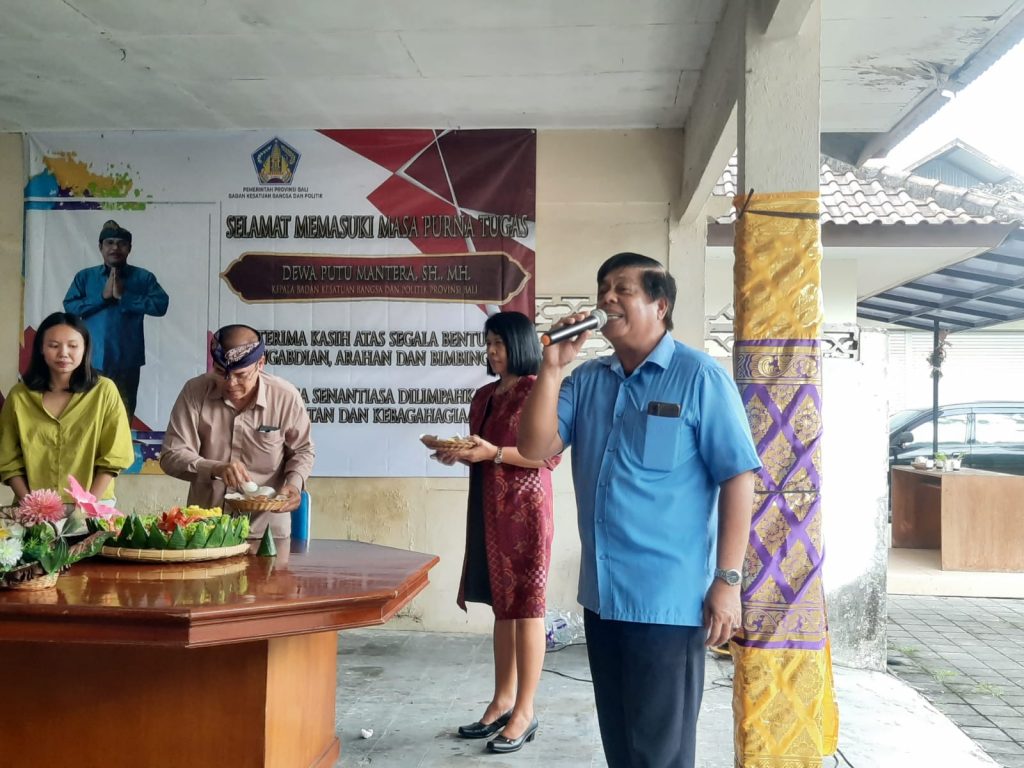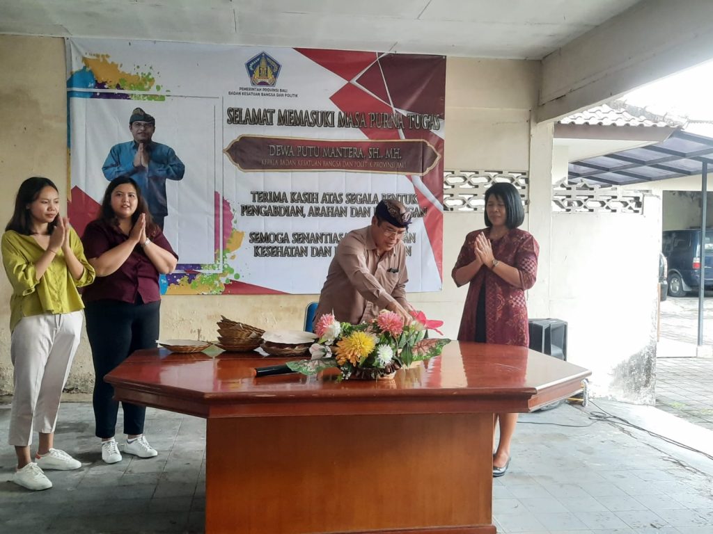 30 Desember 2022. Badan Kesatuan Bangsa dan Politik Provinsi Bali merayakan acara Syukuran Tutup Tahun 2022 dengan Sederhana, sekaligus Melepas Kepala Badan Kesatuan Bangsa dan Politik Provinsi Bali, Dewa Putu Mantera, SH.,MH. karena telah memasuki Masa Purna Tugas beserta 9 Pegawai lainnya yang telah Pensiun di Tahun 2022, yaitu : I Wayan Kariatmaja, S.IP; Drs. I Gusti Agung Komang Kusuma Astawa; Ida Bagus Nuarta, SH; A.A. Sagung Ngurah Indah Windarthi, SH; Ni Gusti Putu Martini, S.Sos; Subani; I Made Patrajaya; I Gede Putra Yasa, SE; Ni Gusti Ayu Nyoman Sukarti. pada kesempatan ini, juga turut mengundang Komuniti Intelijen.